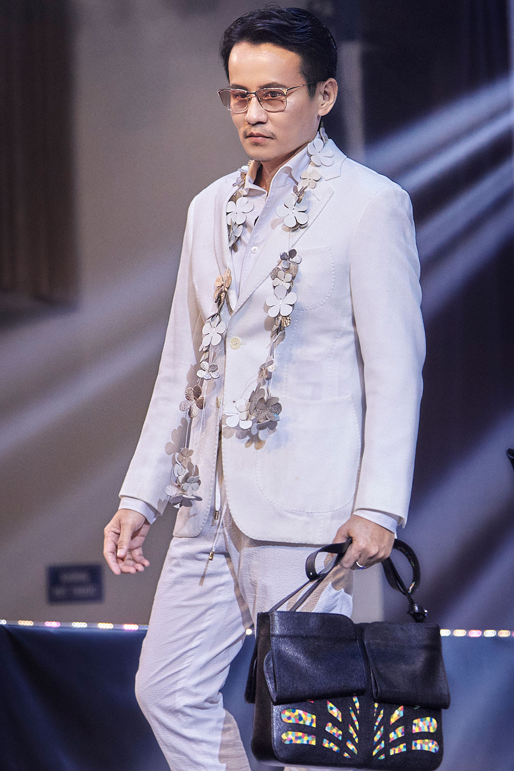 Hồ Quang Mẫn sải bước tự tin, chuyên nghiệp trên sàn diễn. Anh tham gia trình diễn vì muốn ủng hộ tinh thần làm nghề kiên trì theo đuổi thời trang xanh của nhà thiết kế.