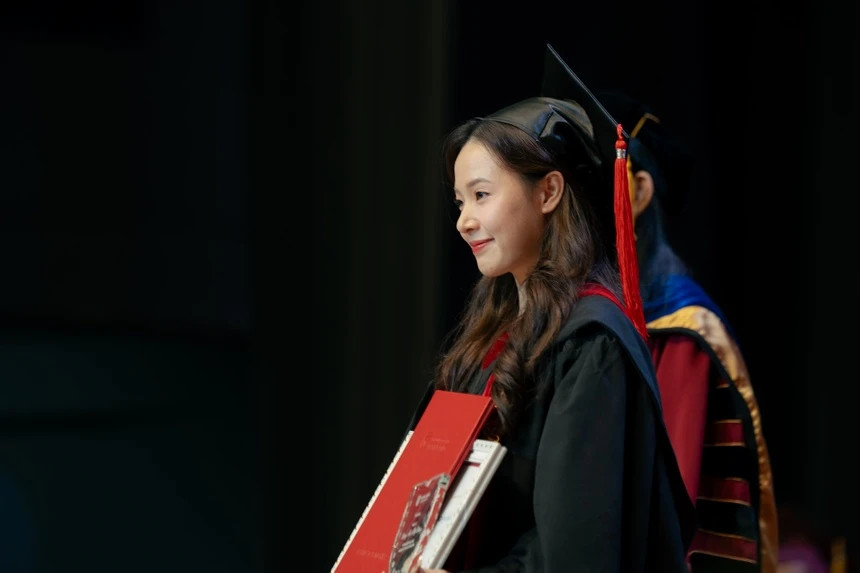 Nữ diễn viên bước lên sân khấu khi được gọi tên. Midu được trao bằng thạc sĩ loại giỏi, ngành Mỹ thuật ứng dụng. Cô bảo vệ thành công đề án tốt nghiệp thạc sĩ vào tháng 3. |