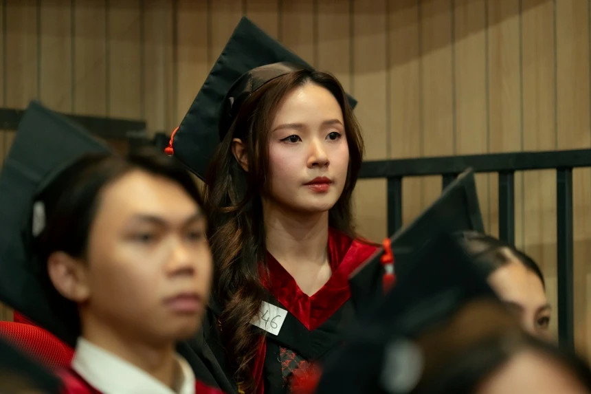 Lễ tốt nghiệp dành cho tân thạc sĩ và cử nhân các ngành của Đại học Văn Lang diễn ra vào ngày 11/8. Diễn viên Midu xuất hiện rạng rỡ trong trang phục cử nhân. Cô thu hút ống kính nhiếp ảnh gia khi có mặt ở hàng ghế của hội trường. |